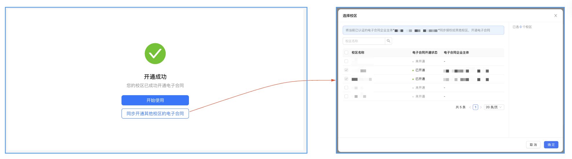 如需同步开通其他校区,则可将已授权企业,同步授权给其他校区开通电子合同