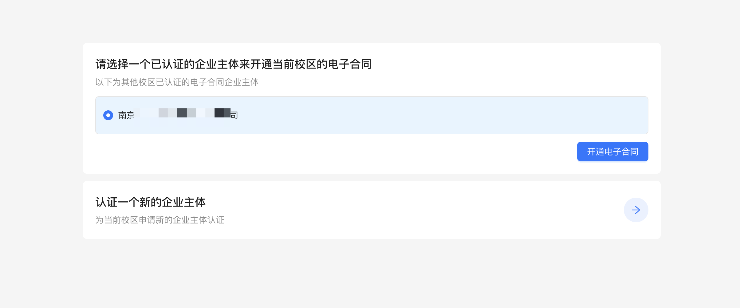 如一家企业已授权,在新的校区重新授权时会提示“重复授权”,此时重新进入菜单>点击立刻开通,“选择已认证的企业主体”开通电子合同即可。