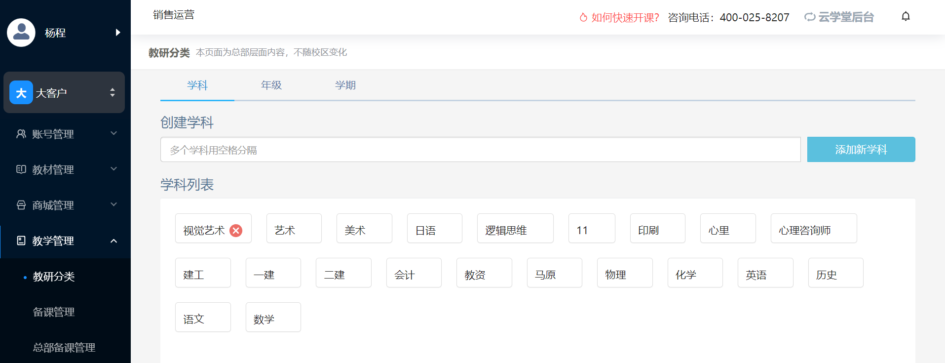 步骤:打开后台管理系统→“教学管理”→“教研分类”→“学科”/“年级”/“学期”