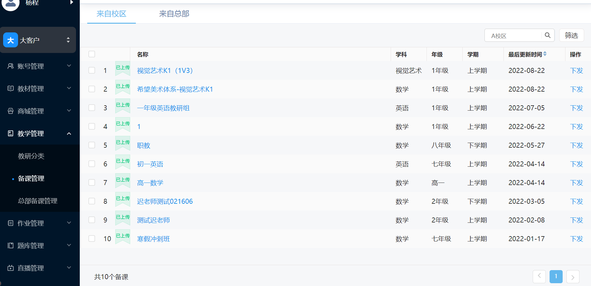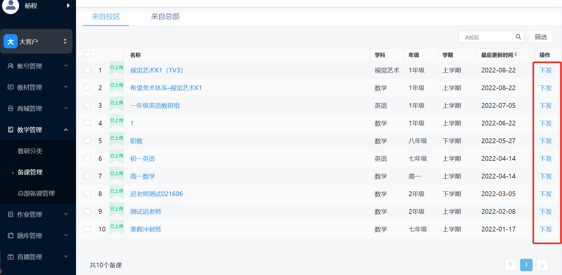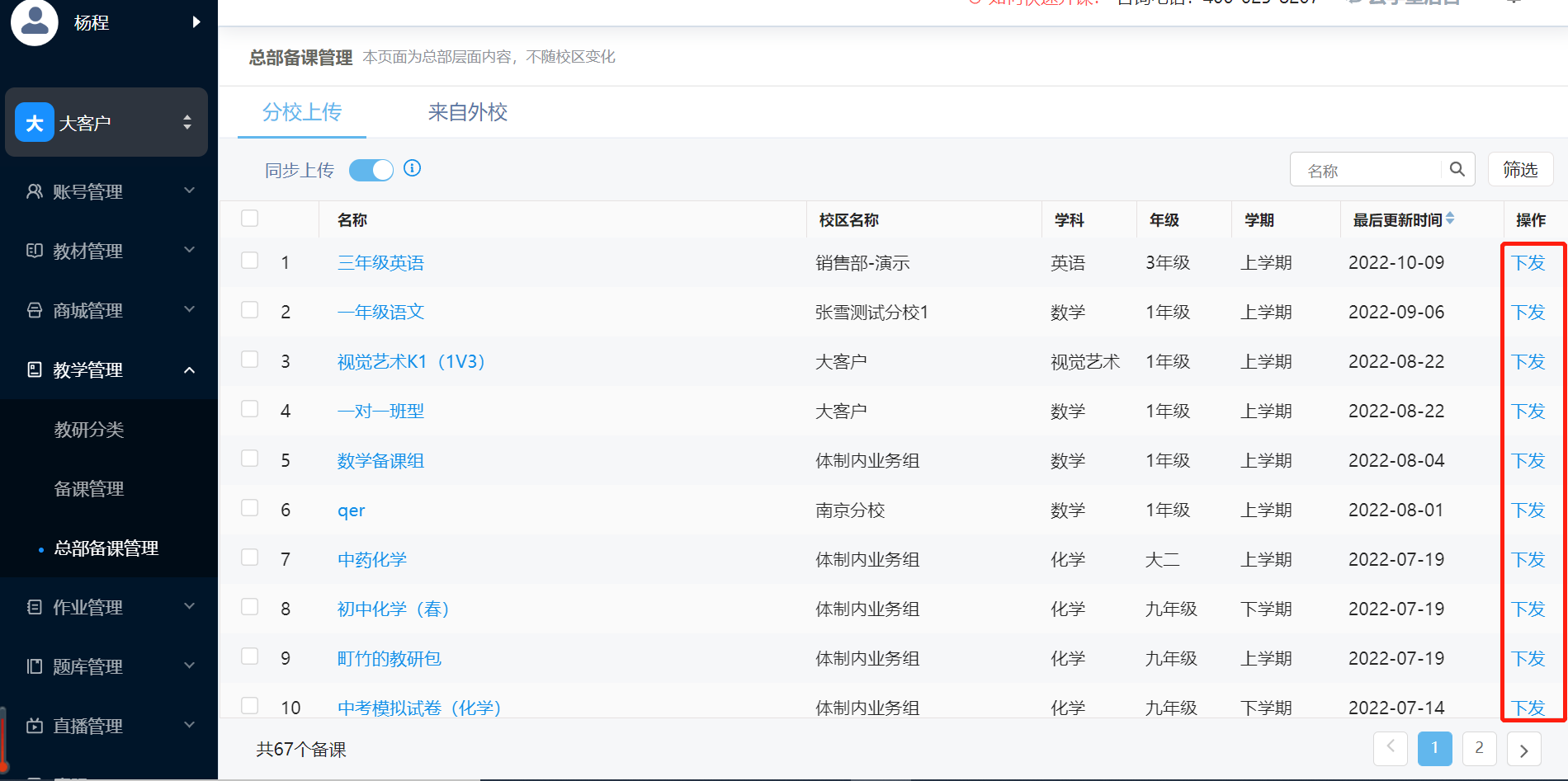 各校区教研组长发布的班型内容可在此统一管理,可将优秀内容下发给其他教研组。