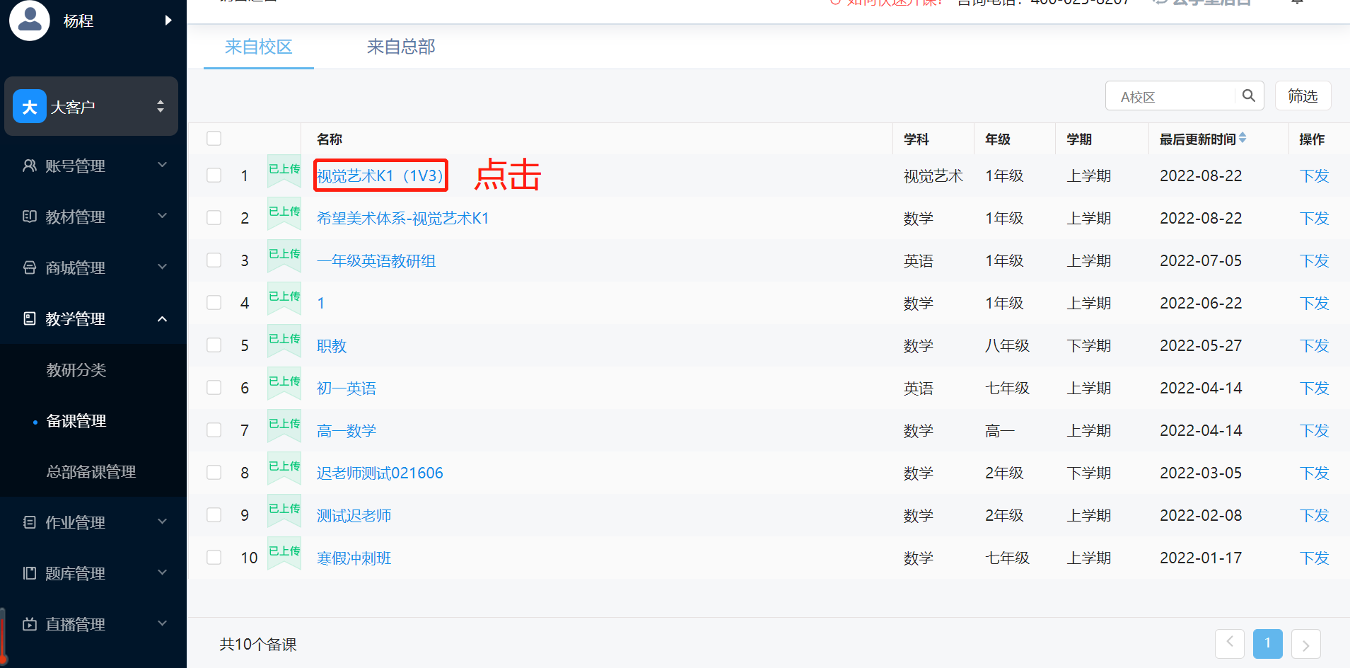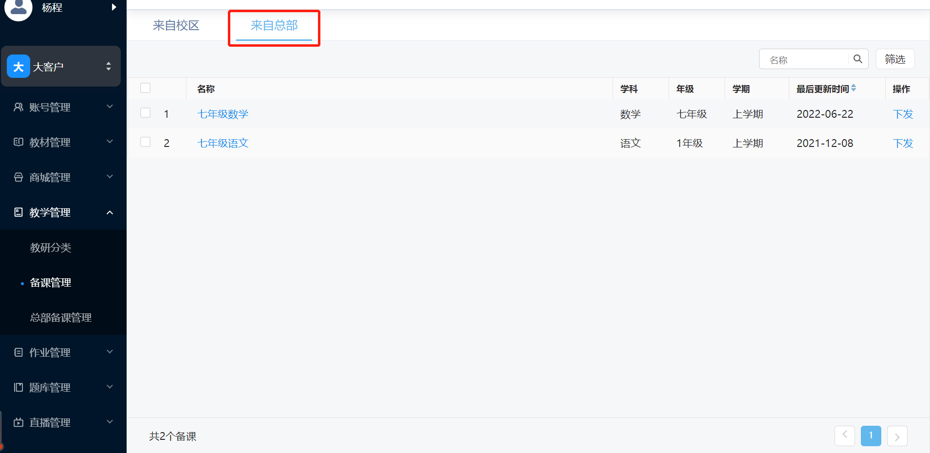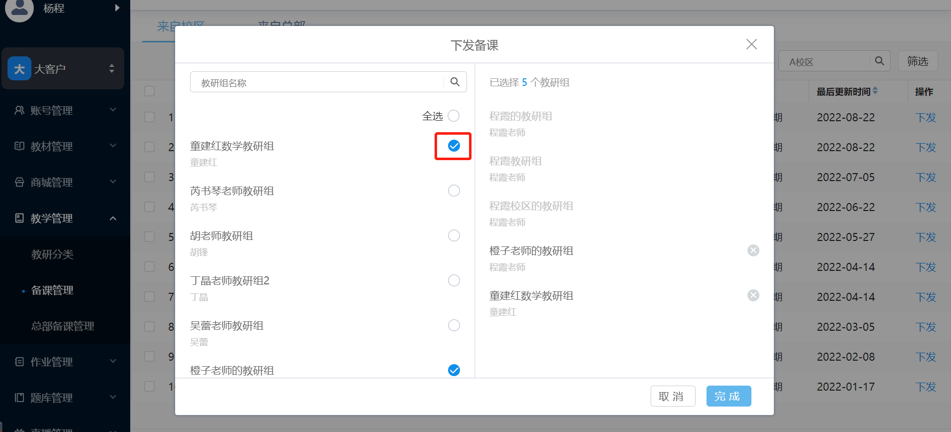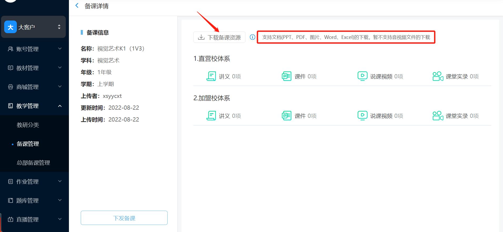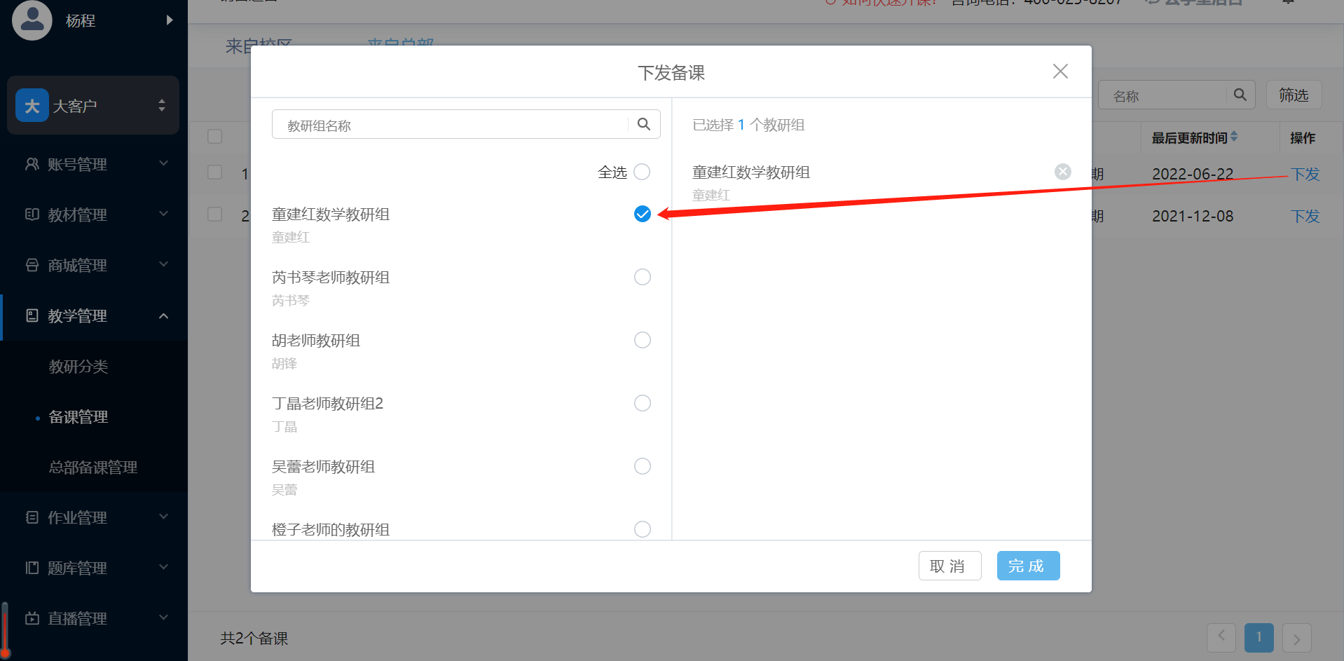 后台管理人员可以将优质的备课内容一键下发给机构的其他教研组,也在后台直接下发备课内容: