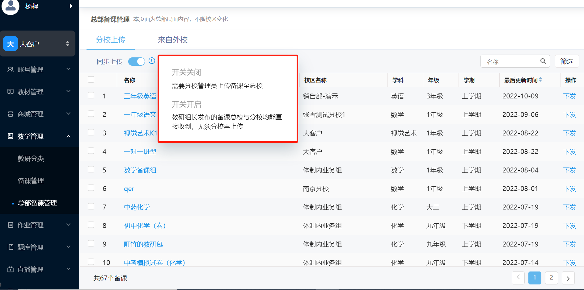 管理员通过“同步上传”按钮控制校区教研组长发布的班型是否需要该校区管理员手动上传至总部。