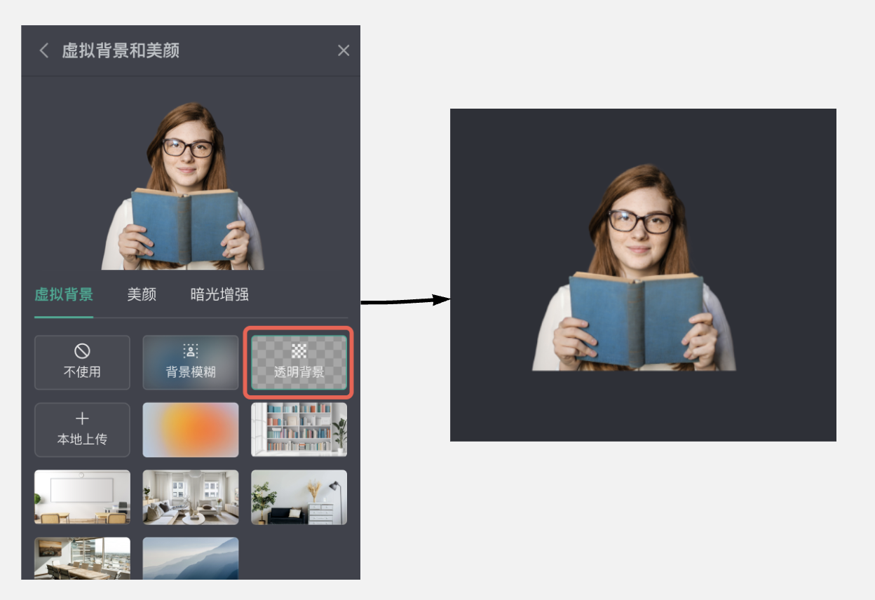 1.PC端极速直播:老师端>虚拟背景设置增加了透明背景选项,使用透明背景后: