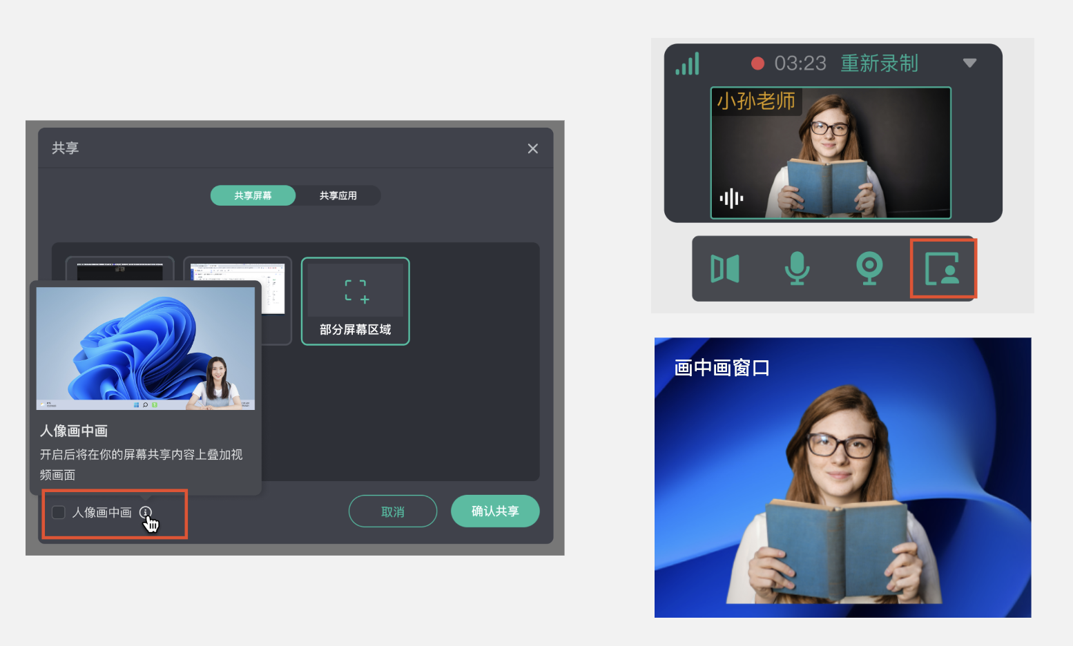 2.Windows端共享屏幕时:Windows电脑共享屏幕时支持勾选人像画中画(共享应用不支持),开启画中画共享后: