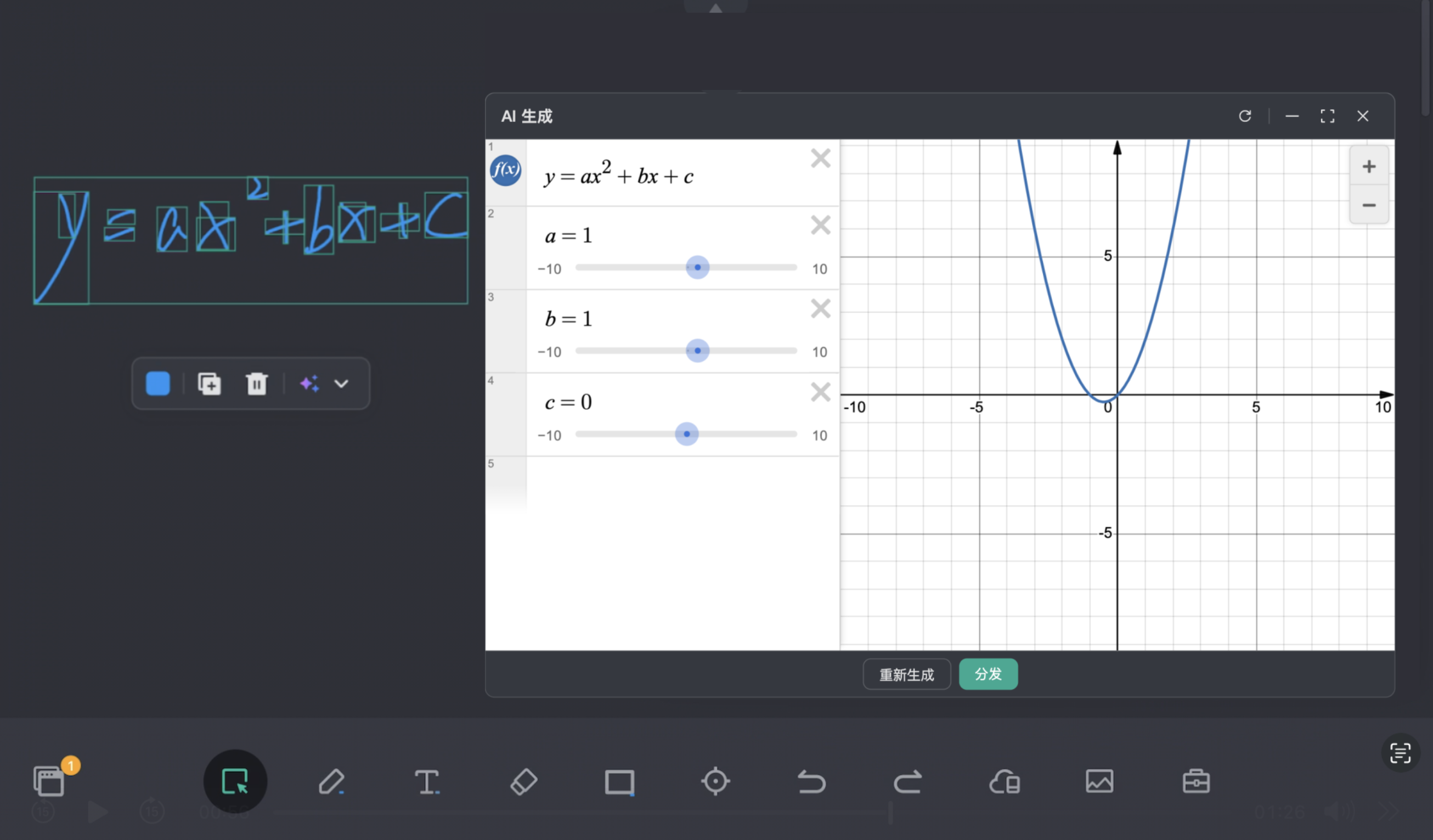4.1. 在黑板中选中内容(板书/图片/图形/文本/混合内容均可),点击菜单栏中的【AI功能】-【生成函数图像】,将基于选中内容生成可交互函数图像网页。