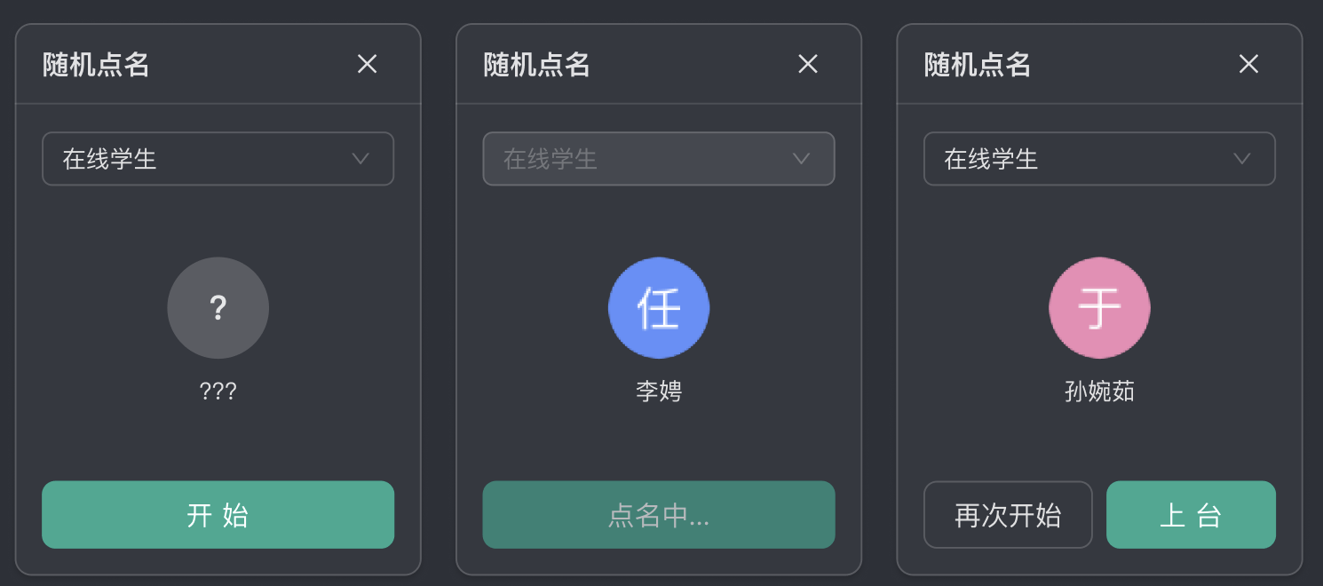 1.5.点名机制:每轮随机选择1人,多轮点名时优先选择未选中的学生