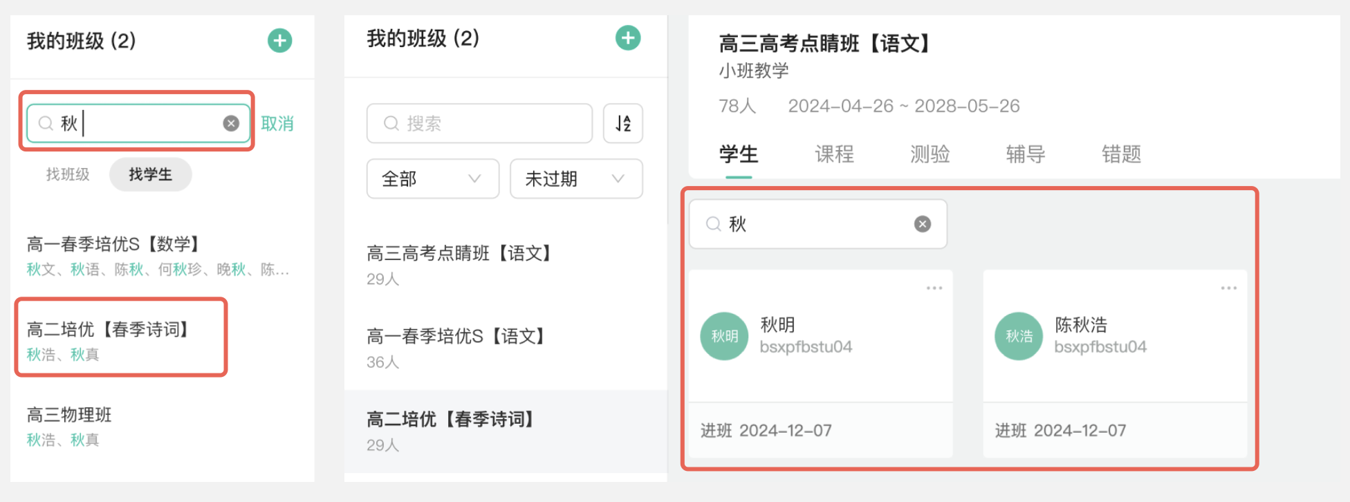 1.1.支持根据学生的姓名、用户名和手机号模糊搜索班级中的学生,高效服务学生