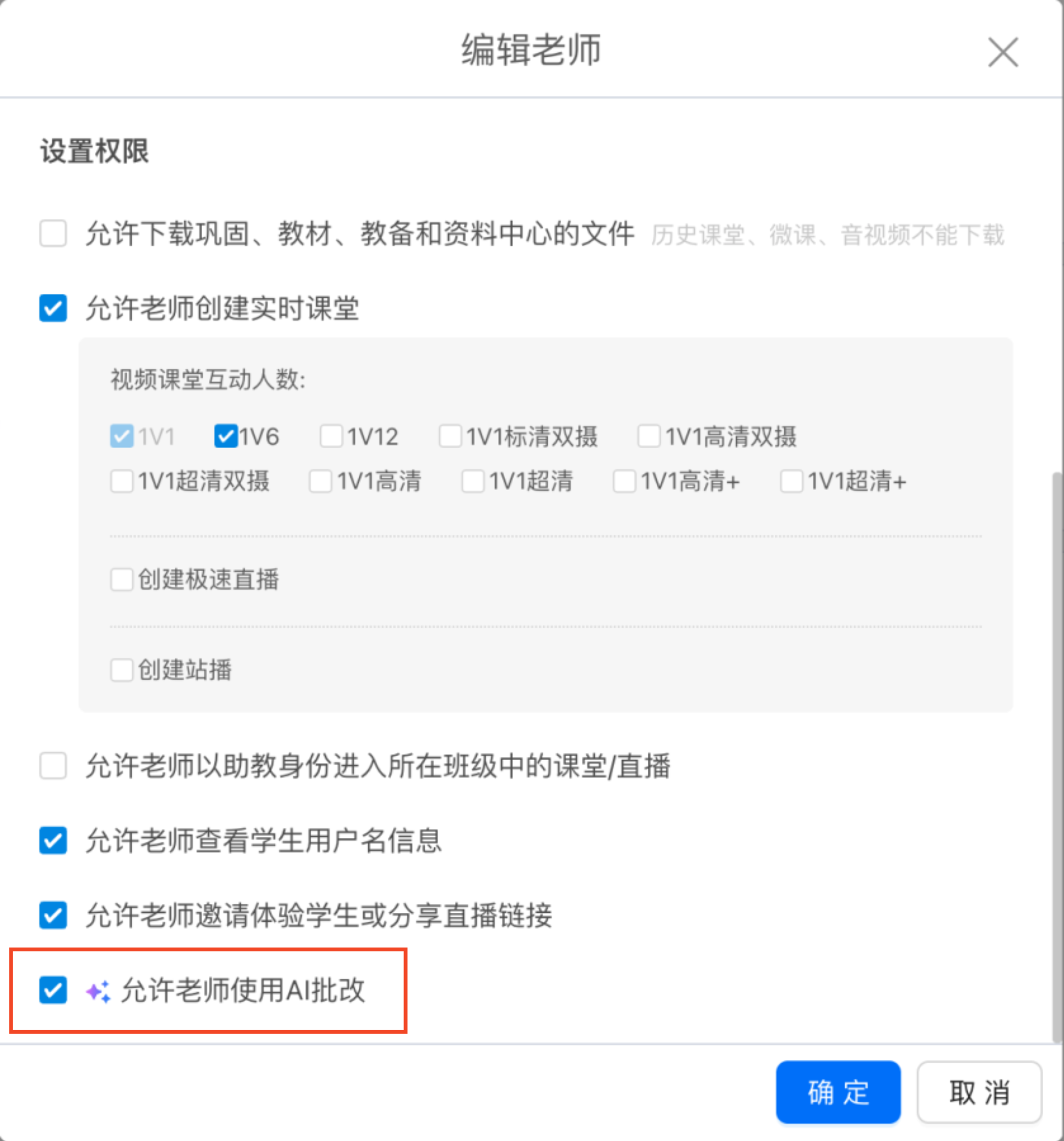 1.2 开启后,总分校管理员可在【账号管理 - 老师管理 - 编辑权限】中为教师开启 AI 批改权限。获得权限的教师即可在作业批改页面使用 AI 批改功能。