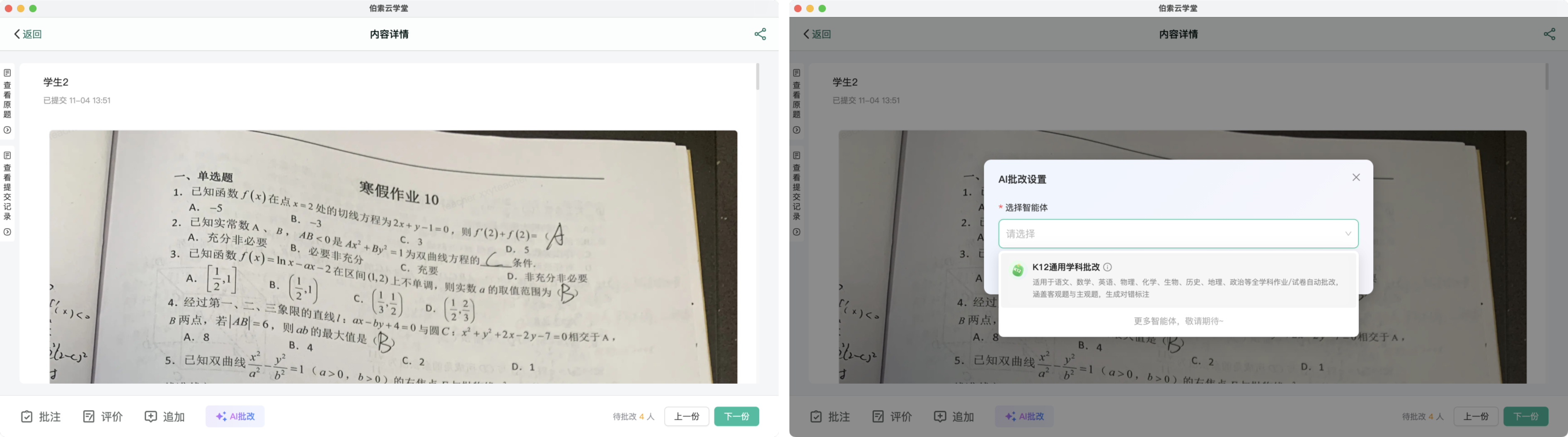 3.1 进入待批改作业详情页,点击「AI批改」,可在智能体选择窗口中预览不同智能体批改效果。