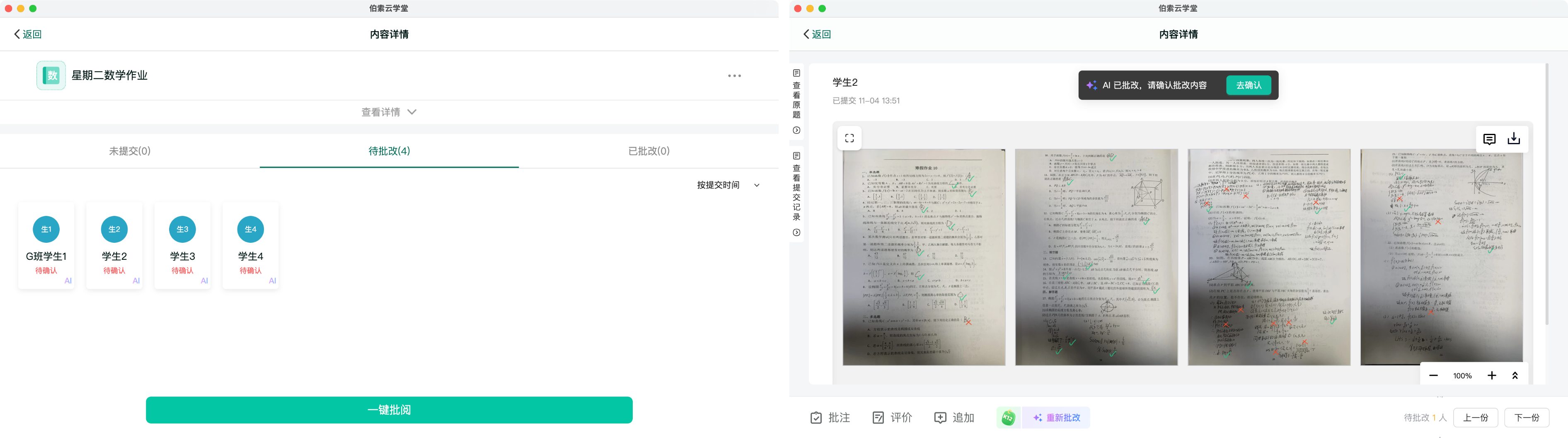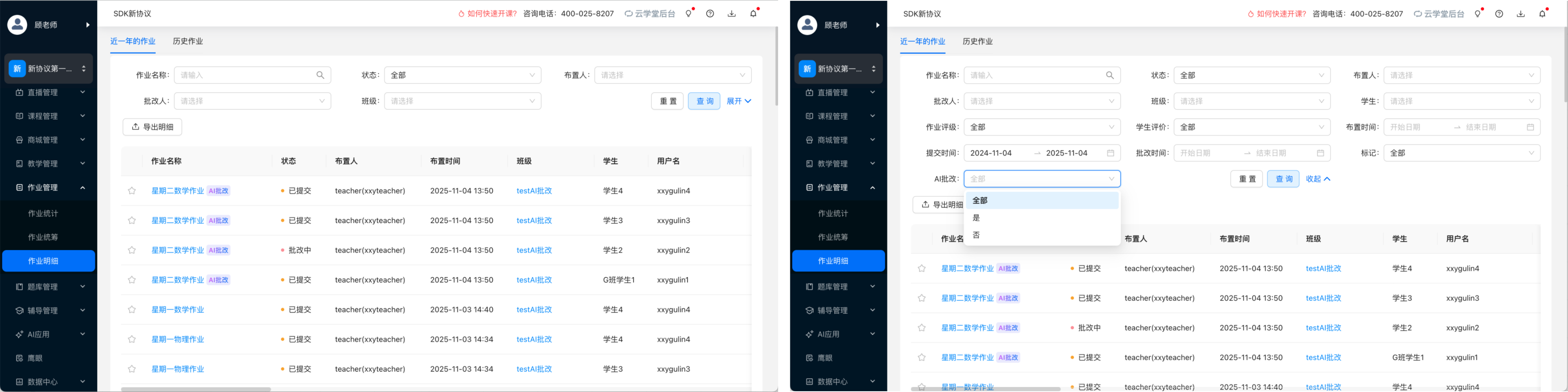 4.1 【后台 - 作业明细】中,AI 批改的作业将带有专属标识,批改人显示为结果审核人,批改时间记录为 AI 开始处理的时间