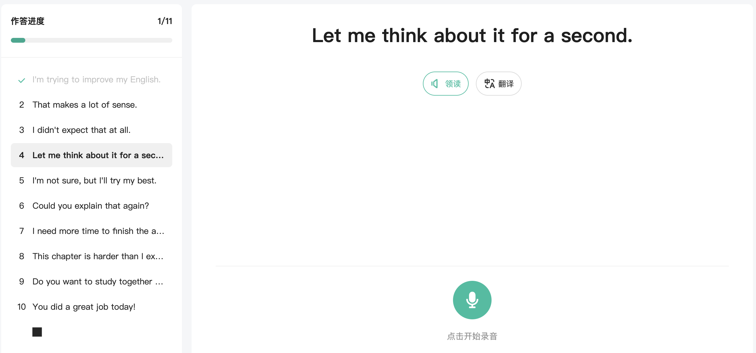 1.学生进入作答页面,AI自动领读,帮助学生更好掌握准确发音